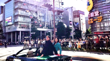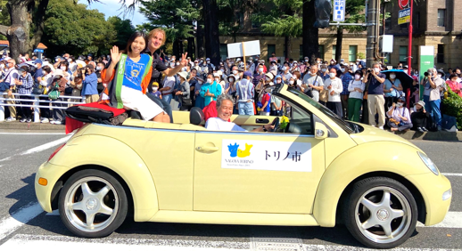 なごや祭りのパレードで姉妹都市トリノ市の車から名古屋市民の皆様にご挨拶